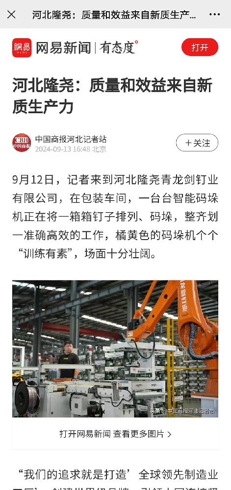 近日,青龍劍釘業憑借在科技創新及產品研發領域的卓越表現,吸引了眾多媒體的關注與報道。此次報道不僅是對公司過往成就的高度認可,更為未來的發展注入了強勁動力。《邢臺新聞聯播》以“【青藍邢動 逐夢泉城】 馬群澤:“釘”住質量 “創”造輝煌”為題,詳細闡述了青龍劍公司總經理、首席質量官馬群澤對公司產品質量關的嚴···[詳情] 2025-02-23 16:18:42